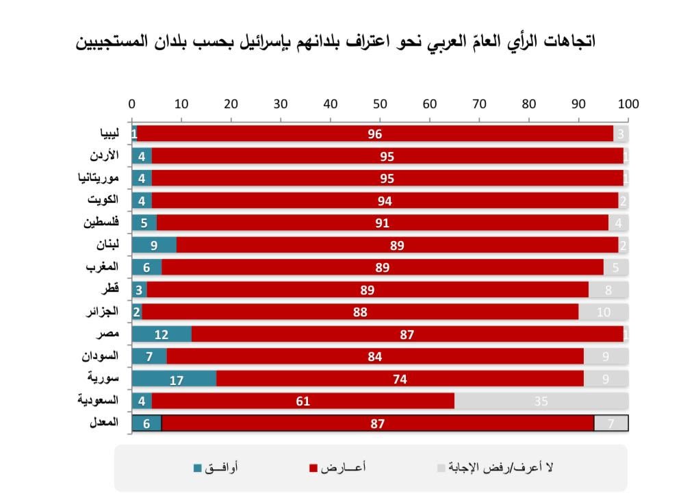 في استطلاع المؤشر العربي الصادر في 6 كانون الثاني عن المركز العربي للأبحاث ودراسة السياسات بيّن أن الرأ الشعبي العربي، بما في ذلك دول الخليج والمغرب العربي، ما زال رافضًا للتطبيع، ومتمسّكًا باعتبار القضية الفلسطينية قضية عربية عامة، وإسرائيل العدو الأول، مع فروقات بين البلدان.